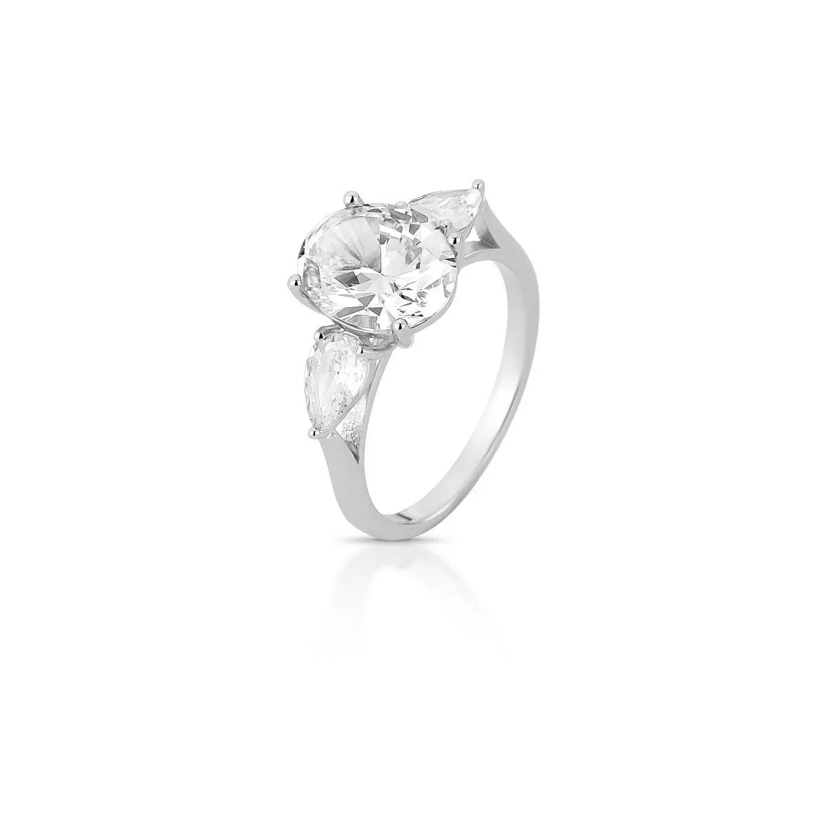 Anel com cristal oval e gota incolor e em prata rodinada Tam 18