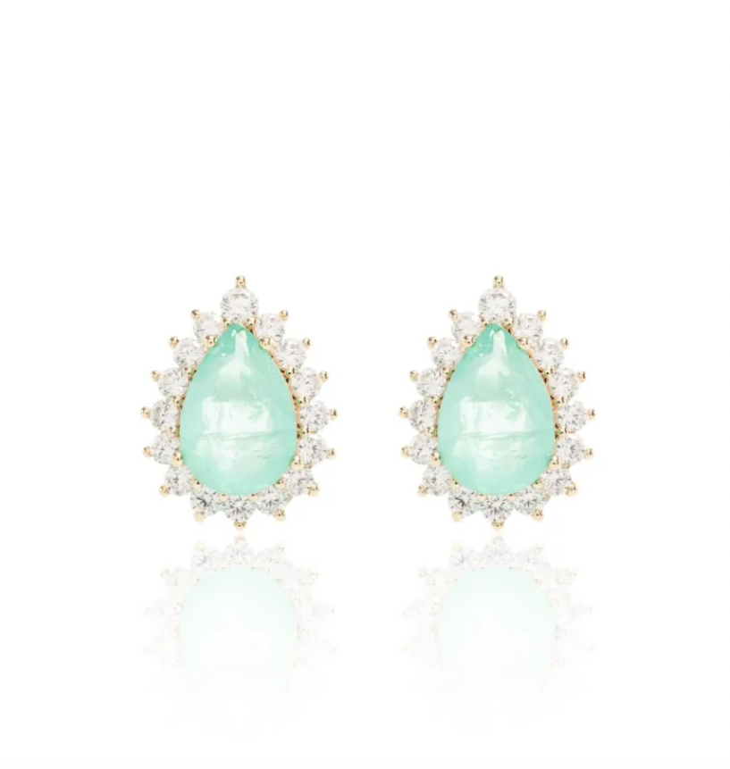 Brinco delicado com gota de fusion turmalina e zircônias brancas bordadas criando um contorno luminoso que realça a beleza da pedra principal e banhado a ouro 18 k