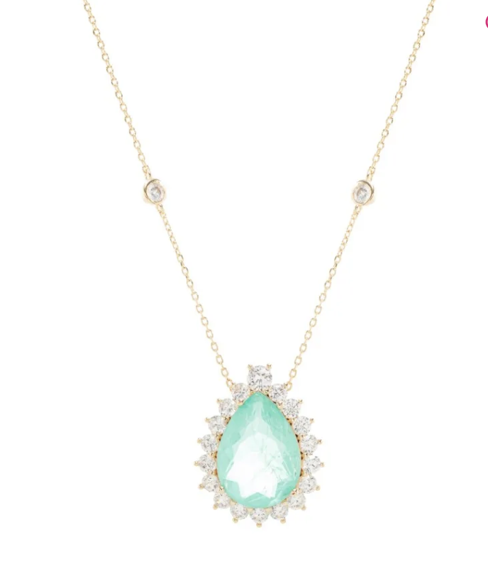 Colar com pingente gota em fusion turmalina e zircônias brancas cravejadas ao redor. destaque para corrente elos cadeados com pontos de luz de zircônias brancas, ressaltando a delicadeza da peça. a corrente está disponível no tamanho de 50 cm e possui extensor com ajuste em até 40 cm. fecho lagosta e banhado a ouro 18 k.