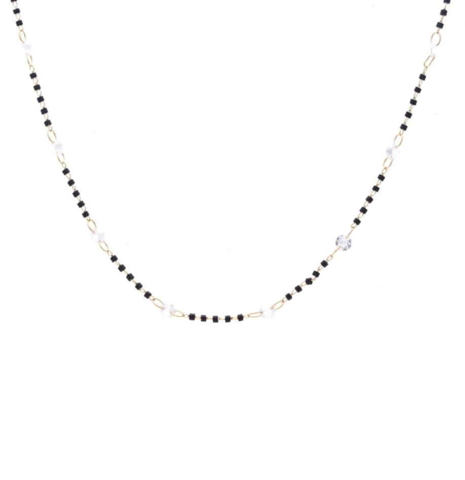 Colar longo com cristais pretos e brancos. fecho boia. confira mais opções de semijoias para sua loja. antialérgico, não contém níquel e banhado a ouro 18k