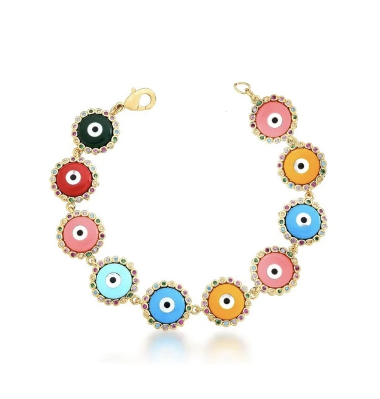 Pulseira de olho grego colorido com zircônia cravejada e coloridas banhado a ródio branco.